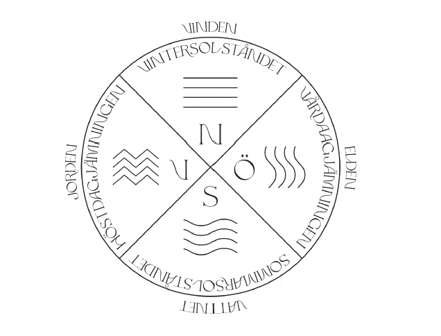 Centralt i vårt utövande av häxkonst och andlighet är årshjulet, och vi pratar ofta om det i podden. Här är därför en bild av det årshjul vi lever och verkar med för att det ska bli lättare att följa med för våra lyssnare. Vårt årshjul kommer från Kathy Jones och Glastonbury Goddess Temple, den tradition vi är utbildade inom. Det finns många andra sätt att se på saken, och inom andra traditioner har elementen andra platser i hjulet. Inget är rätt eller fel.